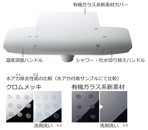 ※2 水アカの溶液を滴下乾燥し、水アカの取れやすさを当社基準で比較。