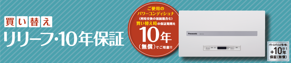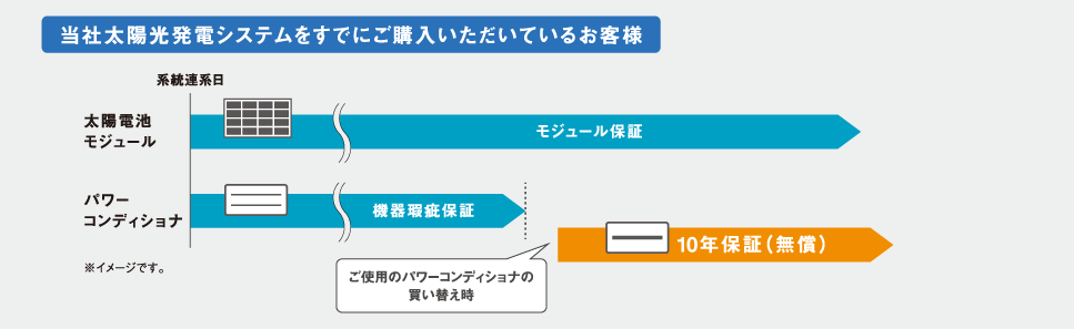 パナソニック製パワーコンディショナ・パワーステーションを採用いただいた太陽光発電システム(他社製太陽電池モジュール・架台 等を含む)を補償。