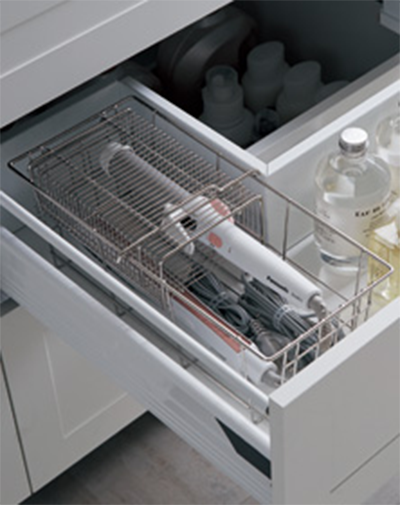 使い終わったらすぐしまう事が、スッキリした空間づくりの基本。でもスタイリング後のドライヤーやヘアアイロンはちょっと熱いのでそのまま置くのはためらわれます。ワイヤーラック式は、収納しながら冷ますことができるので、出しっぱなしを防げます。