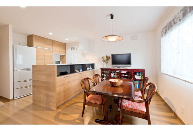 築50年の戸建てで、家族と過ごす時間を大切にしたLDKの改修事例です。狭く暗かったキッチンの位置を変え、間取りを見直すことで、リビングを見渡しながら料理ができる空間に。段差をなくしてバリアフリー化し、娘さんが帰省したときも一緒に快適に過ごせるよう配慮しました。明るく広々としたLDKで、家族のコミュニケーションが自然に生まれる住まいになりました。