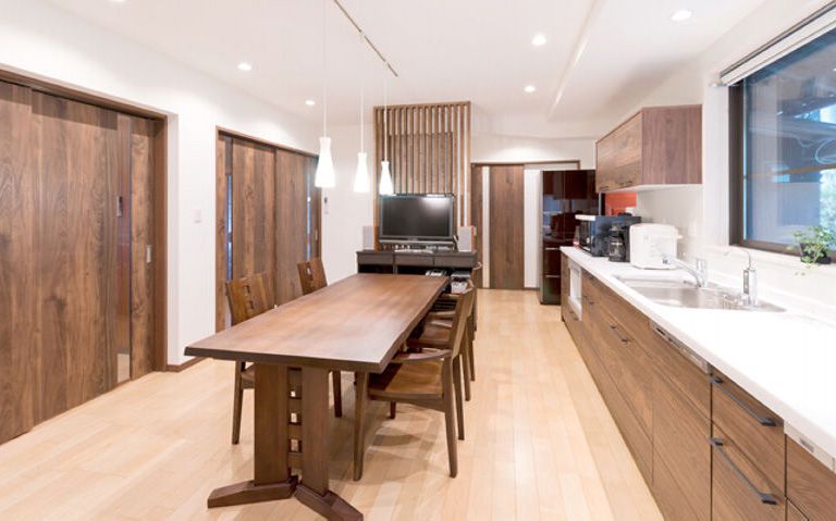 築10年の戸建てで、家族の暮らしに合わせた増改築の事例です。キッチン横にデスクを併設し、テレワークや子どもの学習を見守れる空間に。ウォールナットの無垢材の床とスッキリした壁・天井で温かみと開放感を両立しました。さらに吹き抜け部分を活用し、猫用のスペースも確保しています。使いやすさと収納性をアップさせたことで、家族全員が快適に過ごせる空間になりました。