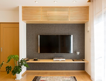 雑誌で探したイメージをリフォーム会社に伝えたところ、希望通りにしてくれたそうです。壁を新設し、棚やルーバーを造作。壁掛けTVの背面にはアクセントクロスを貼り、空間を引き締めています。