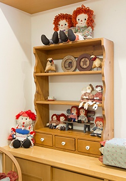 2階リビングは、1階と雰囲気を変えて、アメリカンアンティークを感じさせる空間に。奥様のコレクションの人形たちが可愛らしくディスプレイされ、小物やタイル、ミニシンクなどには、細部までデザインにこだわって作り上げられました。奥様は「思った以上の仕上がりでした!」と微笑んでいらっしゃいます。