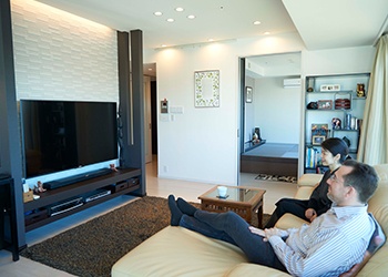 「モノリス」を設置したことで、キッチン、リビング・ダイニングの空間が確立して、LDK全体の使い勝手がよくなり、開放感あふれる空間に。ソファーにゆったり座りながら、大型テレビで映画鑑賞を楽しめます。