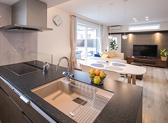 キッチンはマルチワイドIHを採用し、広々としたスペースで料理を楽しみながら、リビングを見渡すことができ、奥様が一番好きな場所になりました。