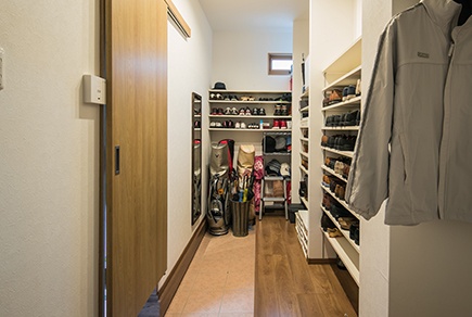 もう一つは、たくさんある荷物の収納。リフォーム前にできる限りの断捨離をされたそうですが、やはり収納スペースが足りず、玄関の横に広々としたシューズインクローゼットを設置。扉を開けると、ゴルフのキャディバックが5つも。かなりのボリュームの荷物が整理整頓できるようになりました。