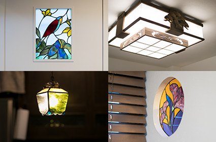 M様のイメージは「西洋文化が日本に入ってきた昭和初期の頃のレトロモダン」な住まい。奥様のお母様が制作されたステンドグラスやレトロな雰囲気の照明器具など、新しい住まいで使用されたいものをご自身で用意されていました。