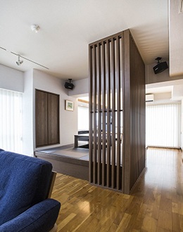 畳スペースには掘りこたつとお仏壇の収納を新設。スリット格子で空間をゆるやかに仕切り、ダイニングコーナーへと導く廊下も生まれました。