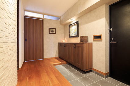 リフォーム後の玄関は、扉を開けるとマンションとは思えないほどの広々とした空間。