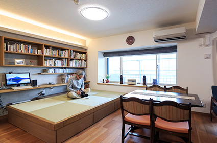 はじめはリビングが狭くなる感じもするし、和洋が混在してしまうのではないかと不安だったそうです。しかし、リフォーム後、いざ暮らしてみるとダイニングに座る奥様と畳が丘でくつろぐご主人が同じ目線で会話をすることができたり、畳に座り読書したり、大好きなカメラの手入れをしたり洗濯物を畳んだりと、畳の上で過ごす時間が意外にも多いそうです。ご主人曰く、「小上がりだったことで違和感なく、リビングの空間に溶け込むことができました。」と。畳の下が十分な収納スペースとなっていて、本やレコードもしまうことができ、畳の上に座ると窓からの景色もちょうどいい高さで見ることができて、くつろぎの空間となったようです。