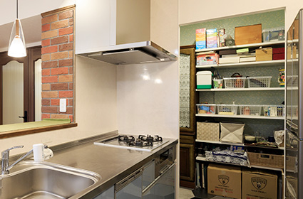 レンジフードは自動洗浄モード付きでお掃除を自動でしてくれるものを選びました。また、パントリーをキッチンの隣に設置したことが、思いのほか、家事効率をアップさせたようです。