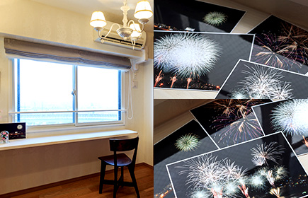 リビングの壁にはご主人が撮影された写真やお二人がお好きな絵画が飾ってあり、広い間口の対面式となったキッチンの前にはプライベートバーさながらのカウンターも設けられました。玄関正面の洋室からは、夏には花火大会の花火を目の前に見ることができ、友人たちが集まるそうです。