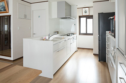 「ショウルームで、淡路島での隠居生活をテーマにした展示を見て、ピン!と来たんです」と、リフォームを決意されるきっかけについて話されたのはご主人。ダイニングとキッチンを“横方向”につなげた開放感たっぷりなプランに、旧居の薄暗くて窮屈な印象だったLDKをガラリと変えるヒントを見つけたとのことです。その後、リフォームのコンシェルジュに相談。驚いたことは、住まいの現状を伝えただけで、その場でさっと間取りのイメージをスケッチしてくれたことだったそうです。「それを見て、あ、これだ!と思い、ずっともやもやしていたものが一気にクリアになりました」と奥様。とはいえ、リフォームの労力もコストも決して小さなものではありません。仕事でまだ忙しい“今”か、リタイア後の“先”か。時期に悩むご夫婦の背中を押したのは、「せっかくリフォームされるのなら、できるだけ長く心地いい空間で暮らしてほしい」というコンシェルジュのひと言でした。