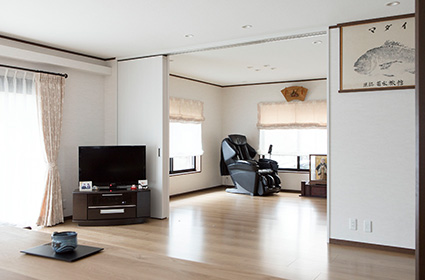 今回のリフォームにあたっては、離れて暮らす息子様ご一家や、近隣に住むご両家の親戚が“楽しく集える住まい”にしたいというのも、ご夫婦の強い希望でした。そのため、1階はひとつながりの大空間としてプランニング。1階和室を洋室に変え、隣のリビングとひとつながりになるようにしました。いずれご夫婦がご高齢になられたときベッドルームとして活用できれば、ワンフロアで生活することも可能です。襖は引戸に変えたことで、開口部の片側にすっきりと収納できるように。また、天井からの垂れ壁がなくなり、リビングと洋室がひとつながりになりました。
