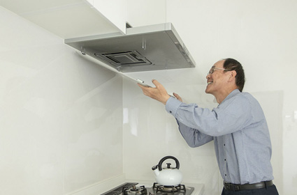 レンジフードは、10年間換気扇のファンのお掃除が不要※な「ほっとくリーンフード」に。毎回のお掃除を担当するご主人への優しい配慮です。