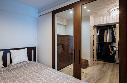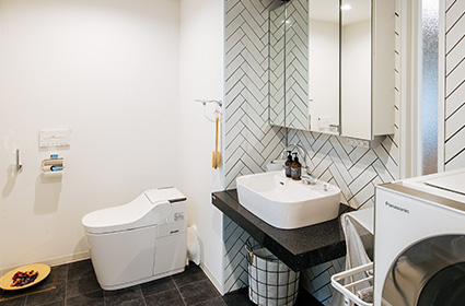 今回のリフォームで浴室を大きくしたことから狭くなってしまうサニタリー空間を、トイレと洗面台の間にあった壁や扉をなくしオープンにする事で、広々と見える空間に。浴室の壁も圧迫感を無くすために透明なガラス戸にしました。洗面台の廻りの壁には人気のヘリンボーン柄の模様のタイルをあしらい、スタイリッシュな空間を引き立てています。浴室も大きなサイズになり、ゆったりとくつろげる空間に。
