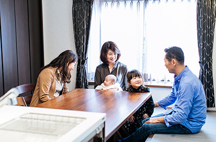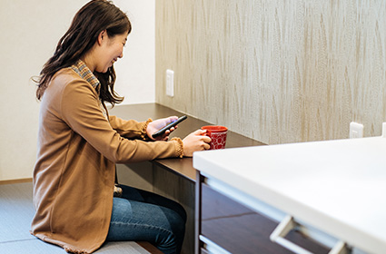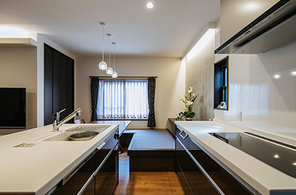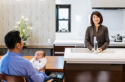 さらにの満足度を高めたのが、キッチンを快適に使える機能。Ⅱ型に配置されたキッチンに設置された加熱機器『マルチワイドIH』。これまではガスコンロを使用されていましたが、ショウルームのIHクッキングヒーターのイベントで実際に体験。IHの火力や4つのコンロが同時に使えるといった機能面はもちろんのこと、何よりも掃除のしやすさで選ばれました。「オープンになったことで、いつも見える空間になったキッチンは常に人の目が気になります。IHにしたことで、サッと拭きとるだけでキレイになります。シンクも汚れにくく、簡単な掃除でキレイな状態を保つことができています。」と笑顔の。まだ小さなお孫さんが料理中にキッチンに来ても安心して遊ばせていられるのも笑顔の理由の一つだったようです。