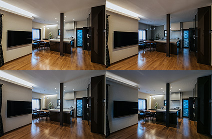 統一された空間をさらに演出するのが照明。ダウンライトや間接照明も調光できるように。ご夫婦お二人での夕食時、お孫さんと一緒に遊ぶときなど、そのシーンに合わせたあかりで楽しまれています。