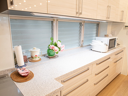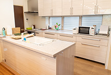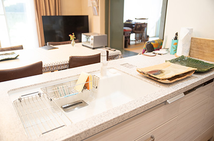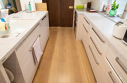 さっと拭くだけできれいになるカウンターやIHクッキングヒーター、水アカが付きにくい有機ガラスの素材の水栓など、お掃除の手軽さにもとても満足されているそうです。