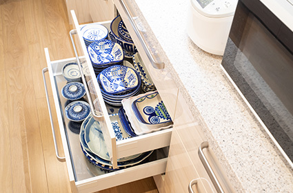 陶芸がご趣味の奥様が手がけた器をはじめ、海外旅行で買い求められた品や頂き物など、多数の食器をお持ちのN様。カウンター下の引出しにも上手に収納。ご家族との食事では、お料理に合わせていろいろなお皿を使い分けられるとか。洗い物が増えても、ダイニングから食器を片付けやすくなったオープンな配置や、作業スペースが十分なシンク、食器洗い乾燥機などを備えたので、洗い物もあっという間に片付き作業がはかどるそうです。