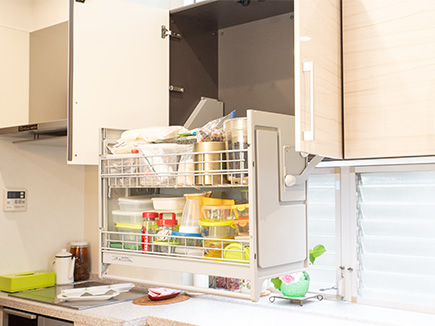 料理のレパートリーも幅広く、お出汁など基本からの手作りを重視される奥様。グリルの横には調味料がずらりと並べられる引出しを設けたり、吊戸棚には保存容器などを取り出しやすい可動式の収納スペースを取り入れたり、米びつやごみ箱などもしっかり収納し、奥様が使いやすいキッチンを叶えるための工夫が随所に施されています。
