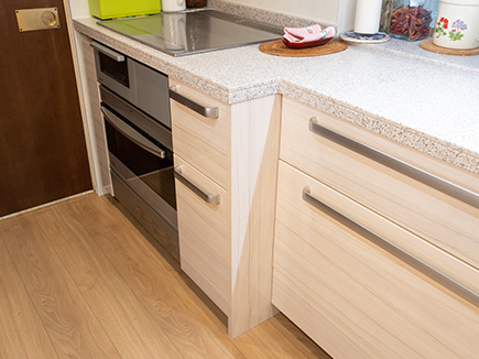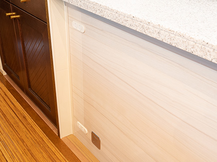 キッチンの扉カラーはマホガニー製の戸棚との色合わせを重視。奥様は、扉を一つ外してショウルームに持ち込まれたそうです。豊富にそろう色目の中から、ややベージュがかったやわらかな色を選ばれたことで、既存の家具と調和しながら、明るく清潔感あふれるキッチンに生まれ変わりました。