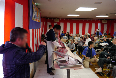 大きなマグロをまるまる一尾の解体ショーにご入居者、ご家族のみなさまも大喜び。