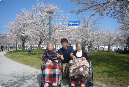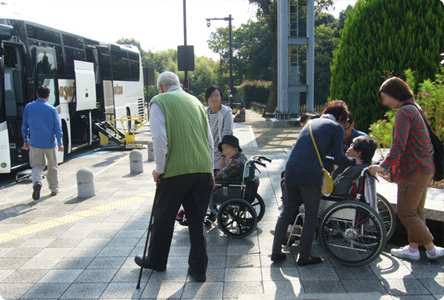 日帰り旅行。リフト付のバスで車いすのご入居者も安心してお楽しみいただけます。