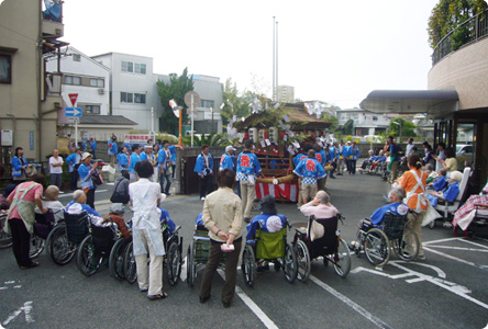 地元の秋祭り。施設の敷地内まで威勢のよい掛け声とともにだんじりが引かれます。