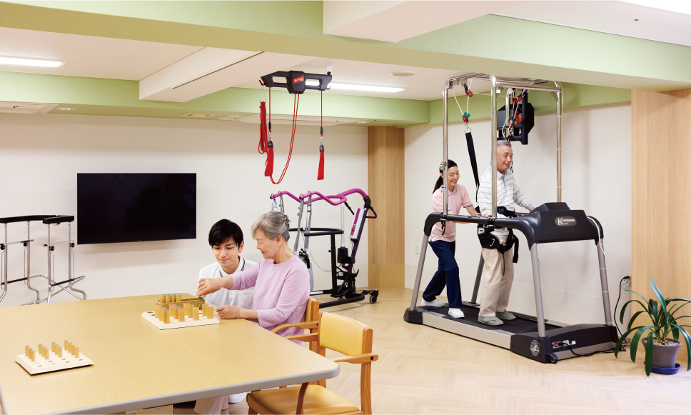 歩行訓練マシンを揃え、脳卒中後遺症に特化したリハビリ設備が充実。