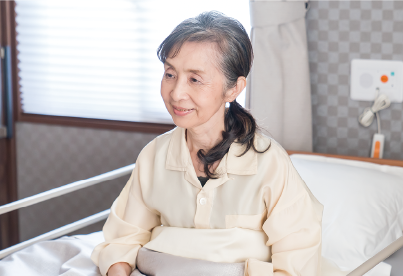 車いすの方 (一部介助)車いすでトイレまで移動できるようスペースを取ってベッドを配置。