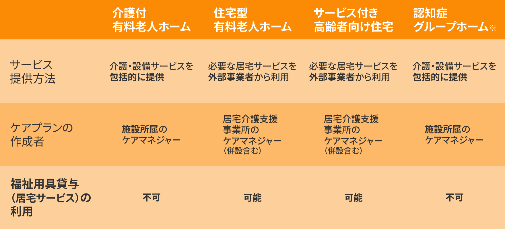 高齢者の住まいの選択肢は、介護老人福祉施設などの施設のほかにもグループホームや有料老人ホーム、サービス付き高齢者向け住宅などさまざまなものがあります。施設の運営形態やサービス利用形態によっても、福祉用具貸与が利用できるのかどうかも変わってきます。