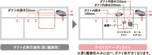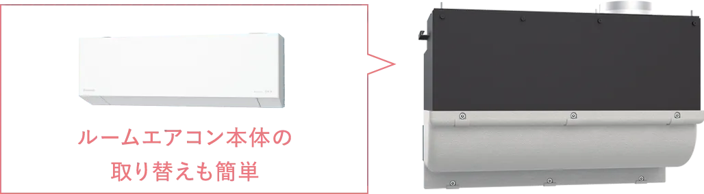 熱交換気にルームエアコンを組み合わせた、シンプルな構成。天井埋込形ではないので、下がり天井などの大がかりな造作も必要ありません。工事の手間やコストを抑えつつ、住まいのデザインを損なわずに取り入れられます。