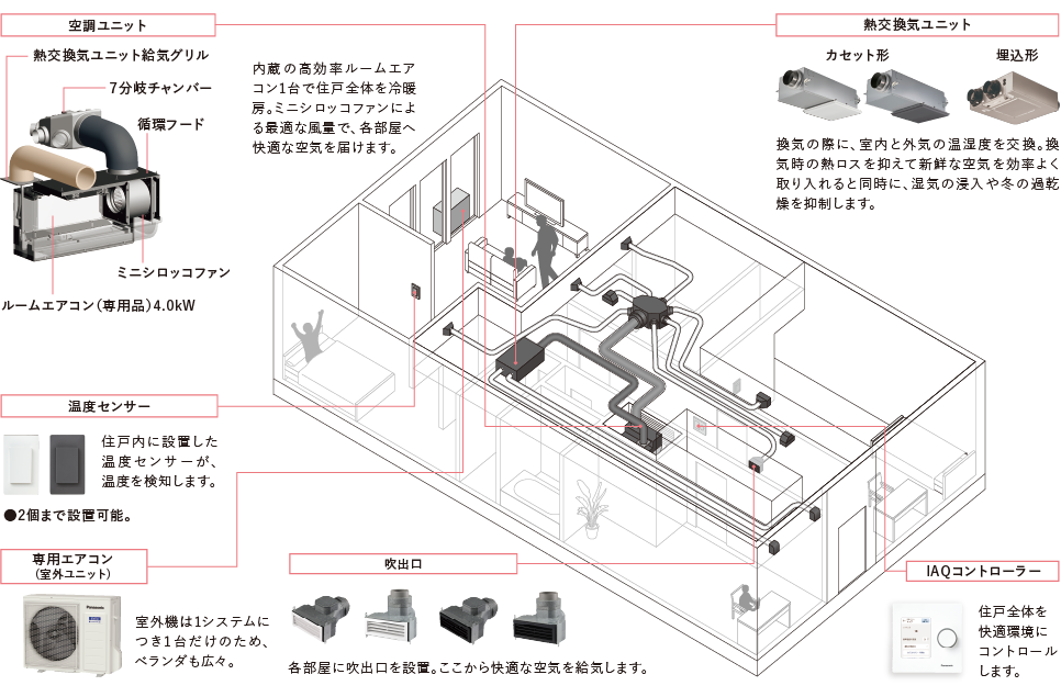 家じゅうの温度と空気を、かしこくコントロールする全館空調です。1フロア1システムで、一年中快適な空間を、手軽に実現できます。