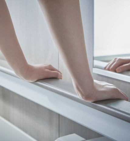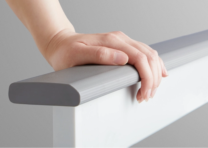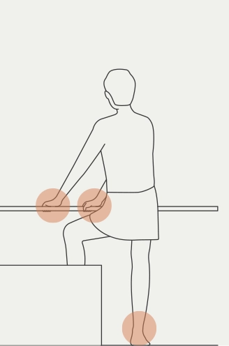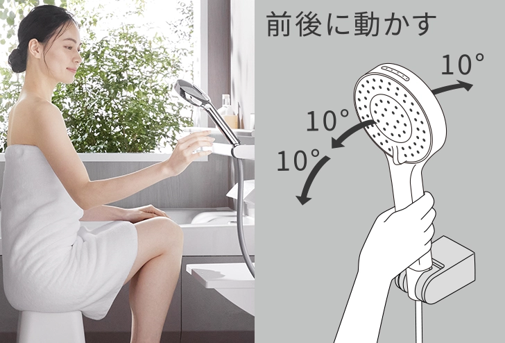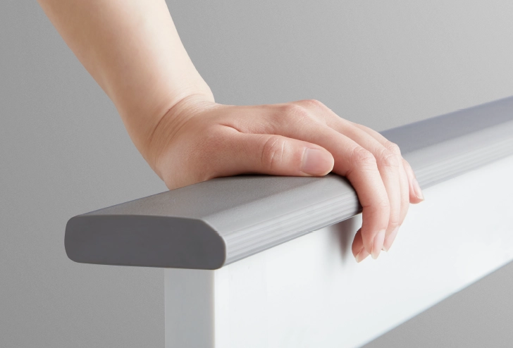 次に注目したのが、横手すりです。イスに座って立ち上がるときや、浴槽に入る移動の際に、身体を支えるための補助として役立ちます。目の前の横手すりを支えにすることで、手の届きやすさや支える面の広さから、安定感を得やすくなります。指がかかりやすく、しっかりと握ることができるため、身体をしっかりと支えることが可能です。浴槽への横移動の際にも、手すりをつかむことで動作がスムーズに行えると感じられます。