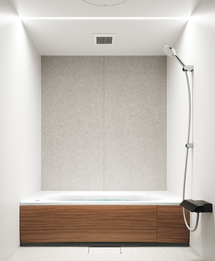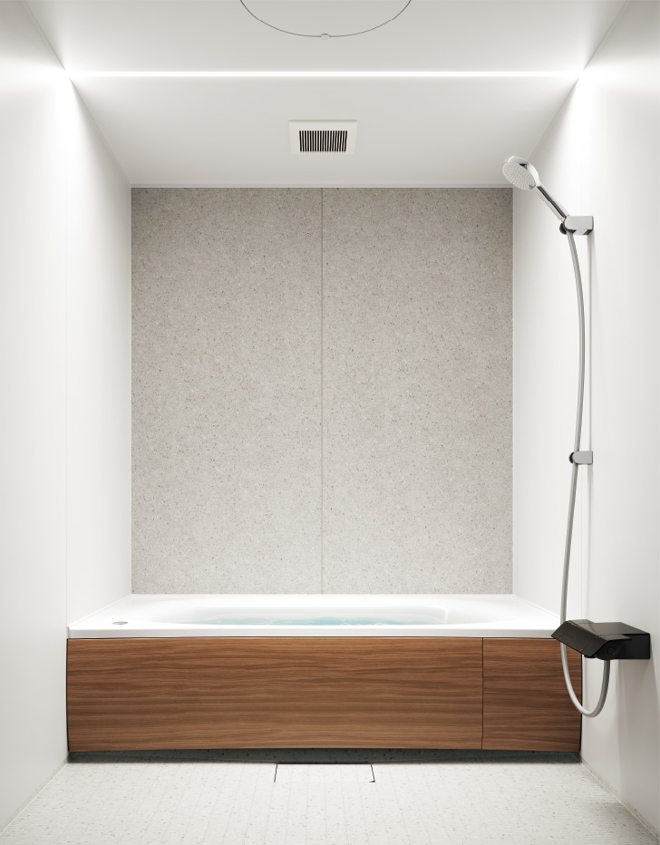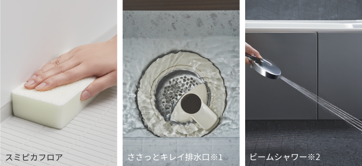 端を立ち上げた床や、継ぎ目のない一体成型の排水口、パワフルな水流で、汚れをサッと洗い流せるシャワーなどお掃除がラクになる工夫を随所に。