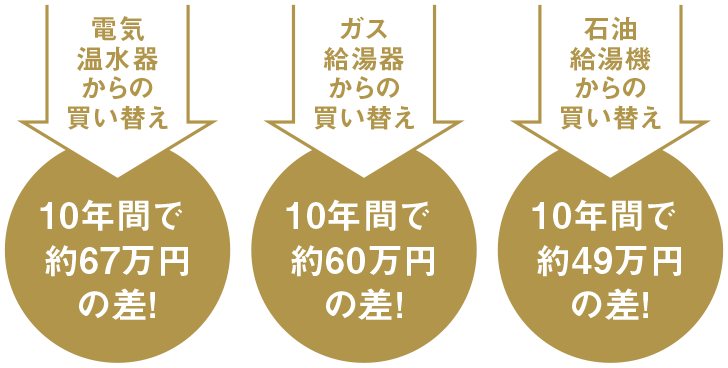 ●家庭用ヒートポンプ給湯機:HE-JPU37LQS電気温水器:DH-37G5QU ●運転モード:「おまかせ節約」 ●外気温、給水温度:大阪地区 ●給湯負荷:日本産業規格 JIS C 9220の年間給湯保温モード熱量 ●電気料金:関西電力「はぴeタイムR」燃料調整額除く 基本料金含まず ※ 2024年9月 当社調べ ●ガス料金:大阪ガス 従量料金単価:169.23円/m³(税込)で算出(基本料金含まず)※ 2024年9月 当社調べ ●石油料金:料金単価:120.5円/L(税込) ※ 2024年7月 当社調べ