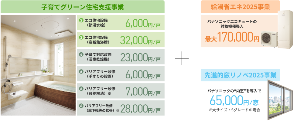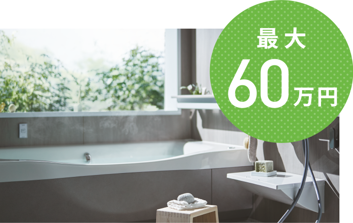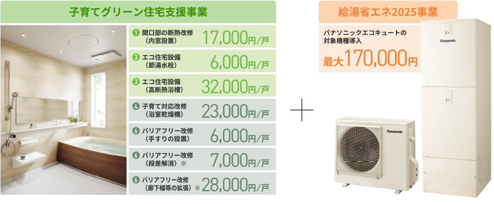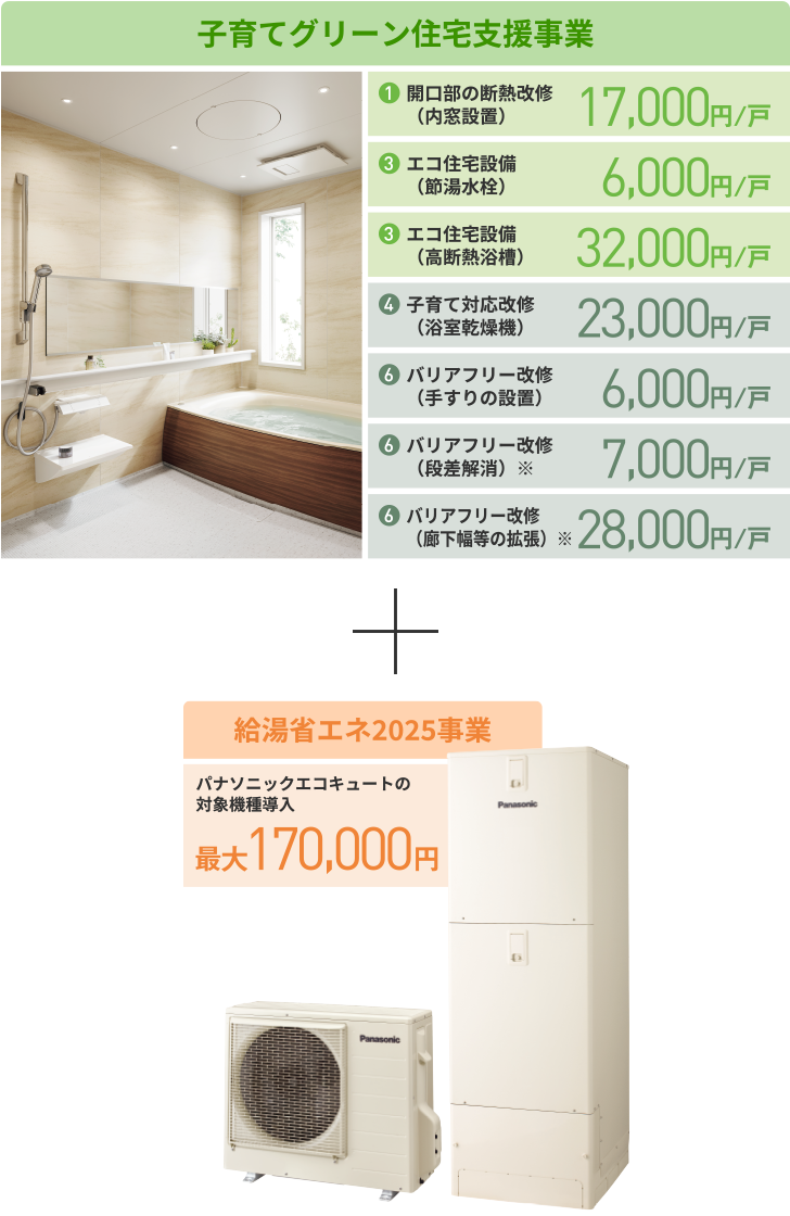 ※ 2025年4月1日ご注文〜2025年9月30日ご納品させていただいたシステムバスルームが対象となります。※ 住宅省エネ2025キャンペーン(リフォーム)の子育てグリーン住宅支援事業該当の商品をご採用いただく必要があります。※ 補助金の対象となるには、①開口部(ドア・窓)の断熱改修もしくは②躯体の断熱改修のいずれかと、該当商品採用の併用が必須となります。詳細は弊社担当者へご確認ください。 ※ 「段差解消」「廊下幅等の拡張」は既存の浴室に対し、出入口の段差を解消したり、出入口の幅を拡張した場合を対象とします。