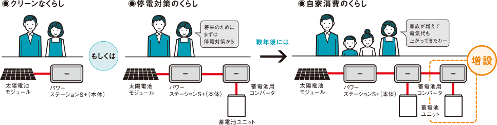 導入時にパワーステーションS+(本体)のみや小容量の蓄電池ユニットでスタートしていても、例えば数年後に居住環境や家族構成が変わるなど、暮らしの変化に合わせて最適な容量の蓄電池ユニットを増設※8することができます。また、増設容量は3.5kWhと5.6kWhと6.3kWhを選ぶことができます。