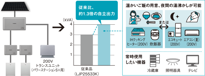 一般的な蓄電システム(停電時自立出力:1.5kVA)では、停電時に冷蔵庫や照明など最低限の機器は使えても、同時に電気ケトルや炊飯器は使えませんでした。創蓄連携システムS+(停電時自立出力:2kVA)なら、電気ケトルや炊飯器が同時に使え、温かい食事をすることができます。さらに200Vトランスを追加することにより、自立出力が最大4kVAになり、エコキュートやIHクッキングヒーターの200V機器も使用することができます。