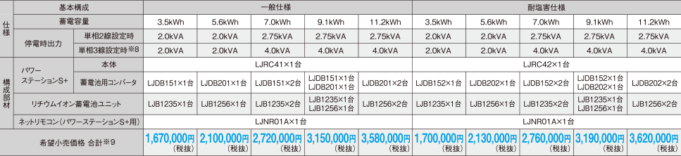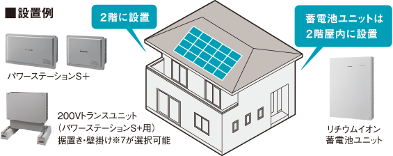 - 注1)22.4kWhにはパワーステーションS+(本体)2台、パワーステーションS+(蓄電地用コンバータ)4台、蓄電池ユニット(5.6kWh)4台、ネットリモコン(パワーステーションS+用)1台が必要です。