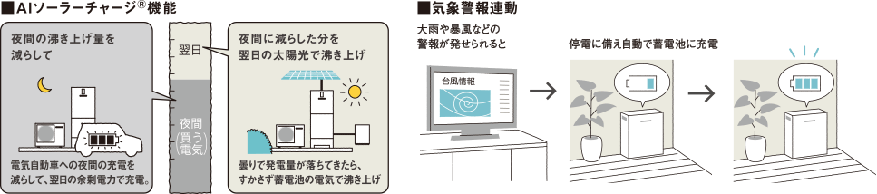 AiSEG2と連携し、翌日の天気予報をもとに自動で太陽光発電の余剰電力を活用する「AIソーラーチャージ機能」や、停電に備え自動で蓄電池ユニットに充電する「気象警報連動」など、家の電気をよりかしこく・より安心に自動制御できます。