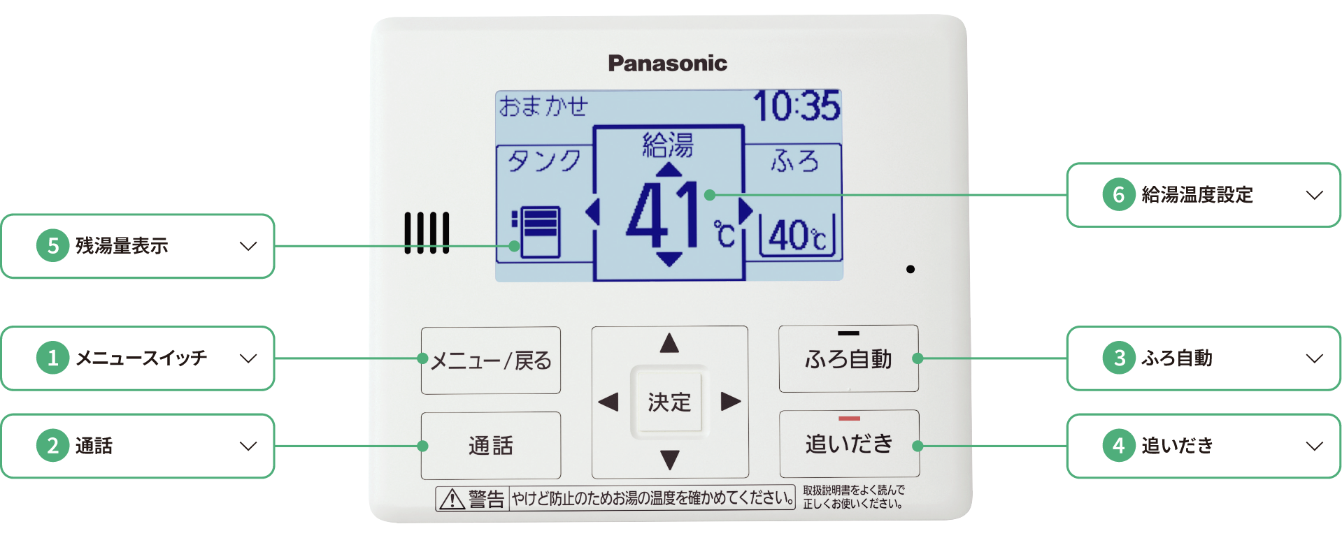 台所と浴室間で会話ができ、操作内容を音声や文字でお知らせするガイダンス付。