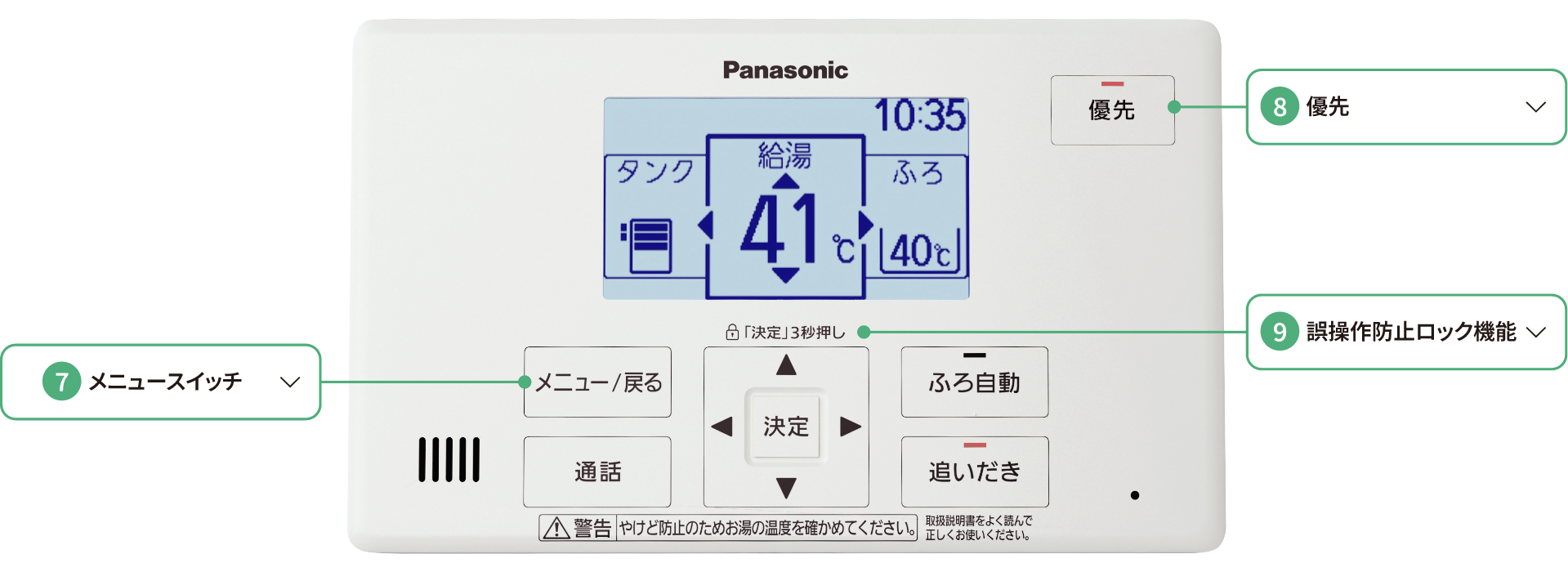 決定スイッチを3秒間押すと、小さなお子さまが、誤って湯温を上げたりしないよう、浴室リモコンの誤操作を防止するためにロックできます。
