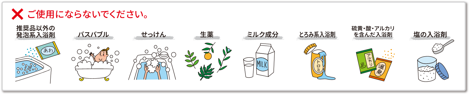 • 推奨品以外の発泡系、バスバブル、石鹸(浴そう内)など