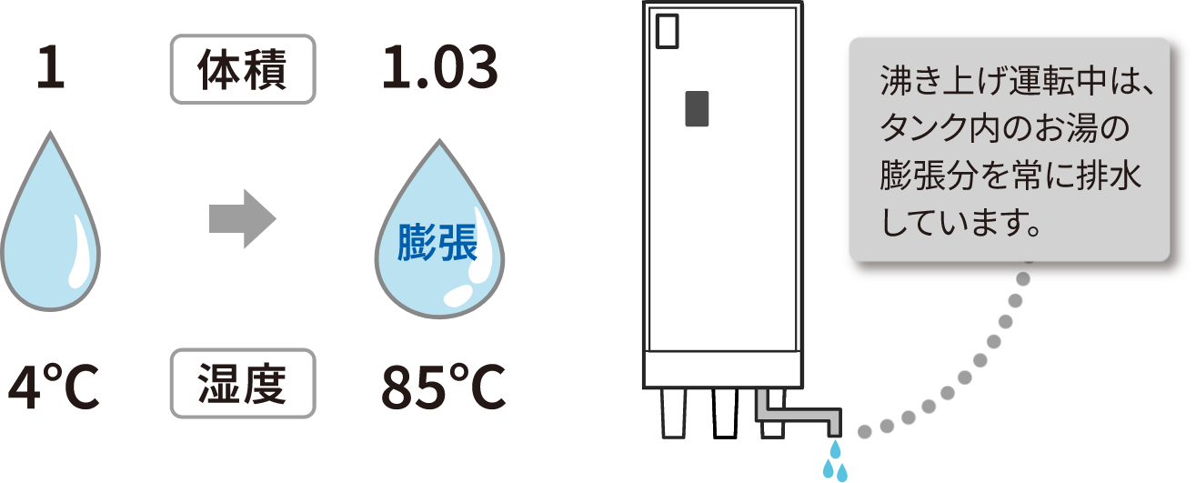 水は温度が上がりお湯になるときに、膨張して体積が増えます。この膨張して増えた分を膨張水と呼びます。内部の圧力を一定にしタンクを保護するため、膨張水は外へ排出する必要があります。この膨張水はタンクより逃し弁を通じて排出され、貯湯ユニット下部の排水配管から排水されます。異常ではありません。