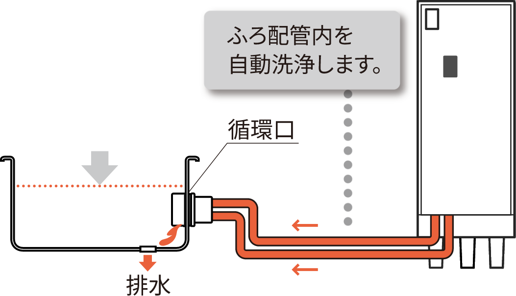 フルオートタイプ全機種に対応しています。浴そうのお湯を抜くたびに、ふろ配管に10Lの水またはお湯を流し、湯あかを洗い流します。