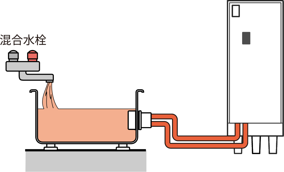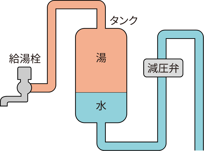 実際には、タンク内のお湯を使用すると、使用した分だけ水道水を給水していますので、常にタンク内には、湯水は満タン状態となります。リモコンの残湯量表示がされていない(減った目盛り)部分は水、または、お湯と水のその中間くらいの温度となります。