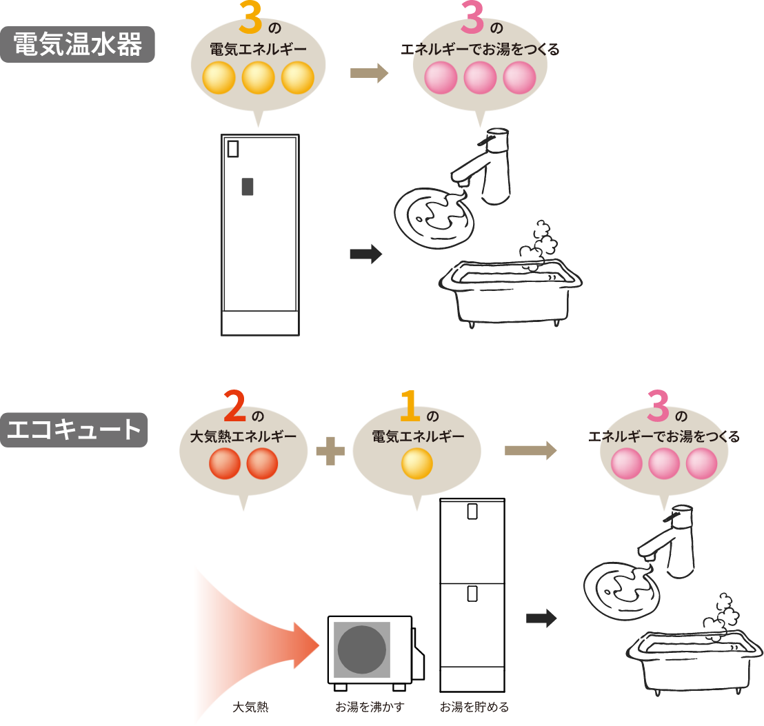 エコキュートは、ヒートポンプにより汲み上げられた大気の熱で効率よくお湯をつくる、省エネ性の高い給湯機です。