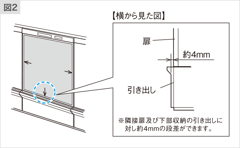 ・足元ストッカーの構造上、設置した食洗機の前面扉は、隣接するキッチンキャビネットの扉面より、約4mm奥に入り込みます。必ずお客様のご了解を得てからお取り組みください。